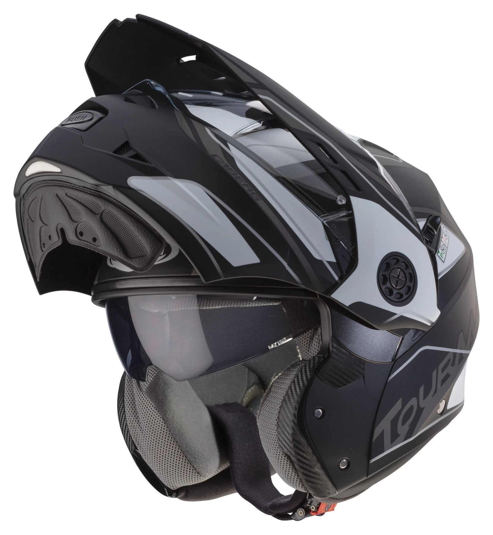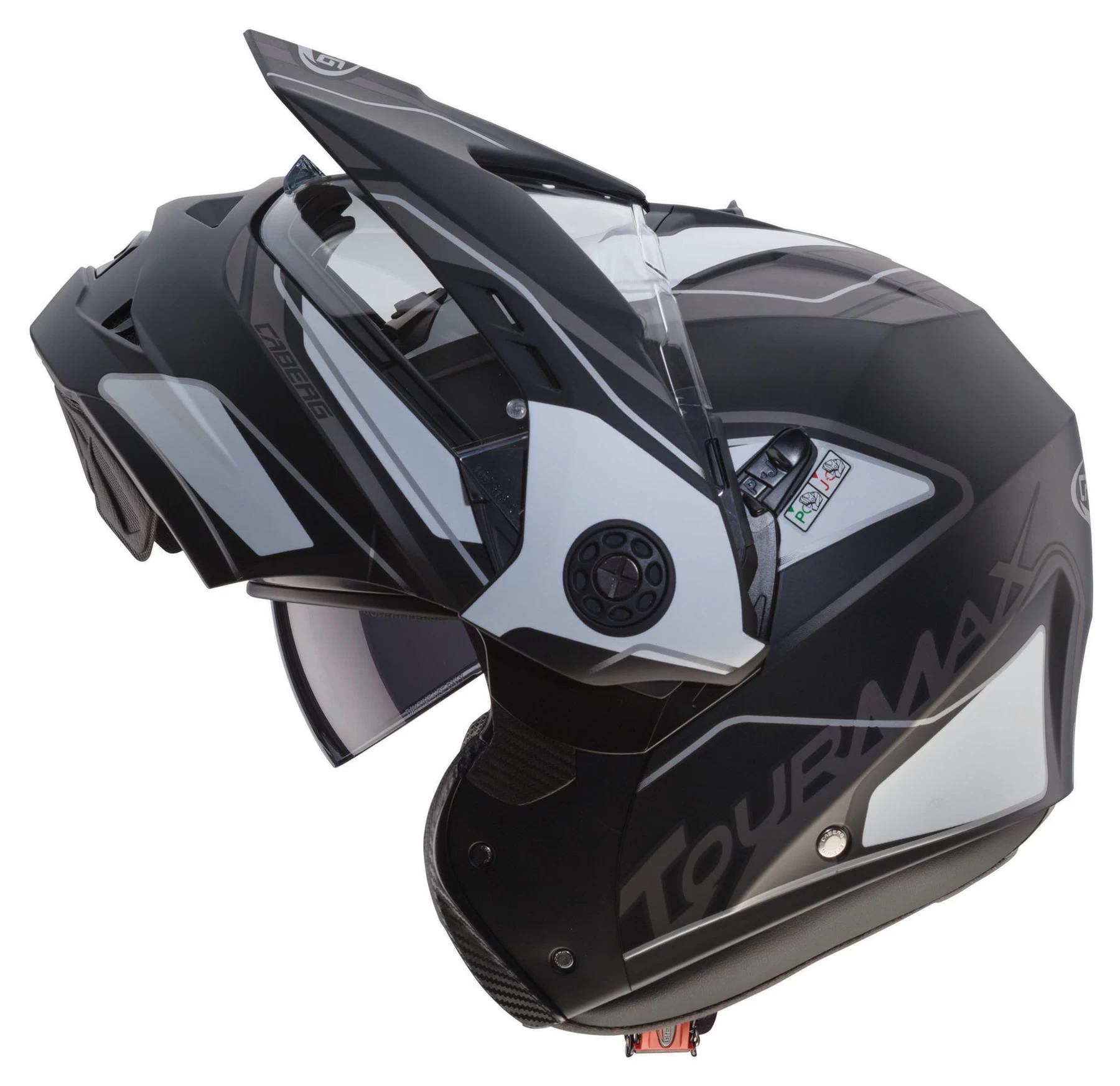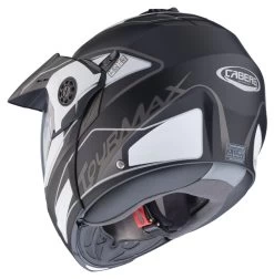 Mit dem Tourmax hat Caberg den ersten Enduro-Klapphelm auf den Markt gebracht. Geschlossen überzeugt das Modell vor allem bei Sonnenschein durch den zusätzlichen Helmschirm. Beim Öffnen klappen Front und Schirm in einem Stück nach oben. So lässt sich der Tourmax auch als Jethelm fahren.